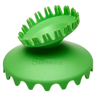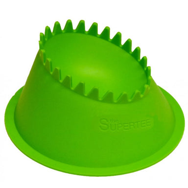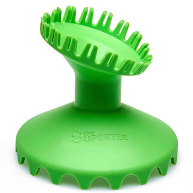 • The Dan Carter Kicking Tee - Supertee Prince is a bright green rugby kicking tee by Dan Carter, featuring a wide stable base, angled top with evenly spaced vertical prongs, and "SUPERTREE" embossed on the side.