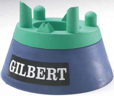 • The Gilbert 320 Precision Kicking Tee is a blue moulded rubber tee with raised supports to hold a rugby ball upright. The white GILBERT logo and name are printed on the side.