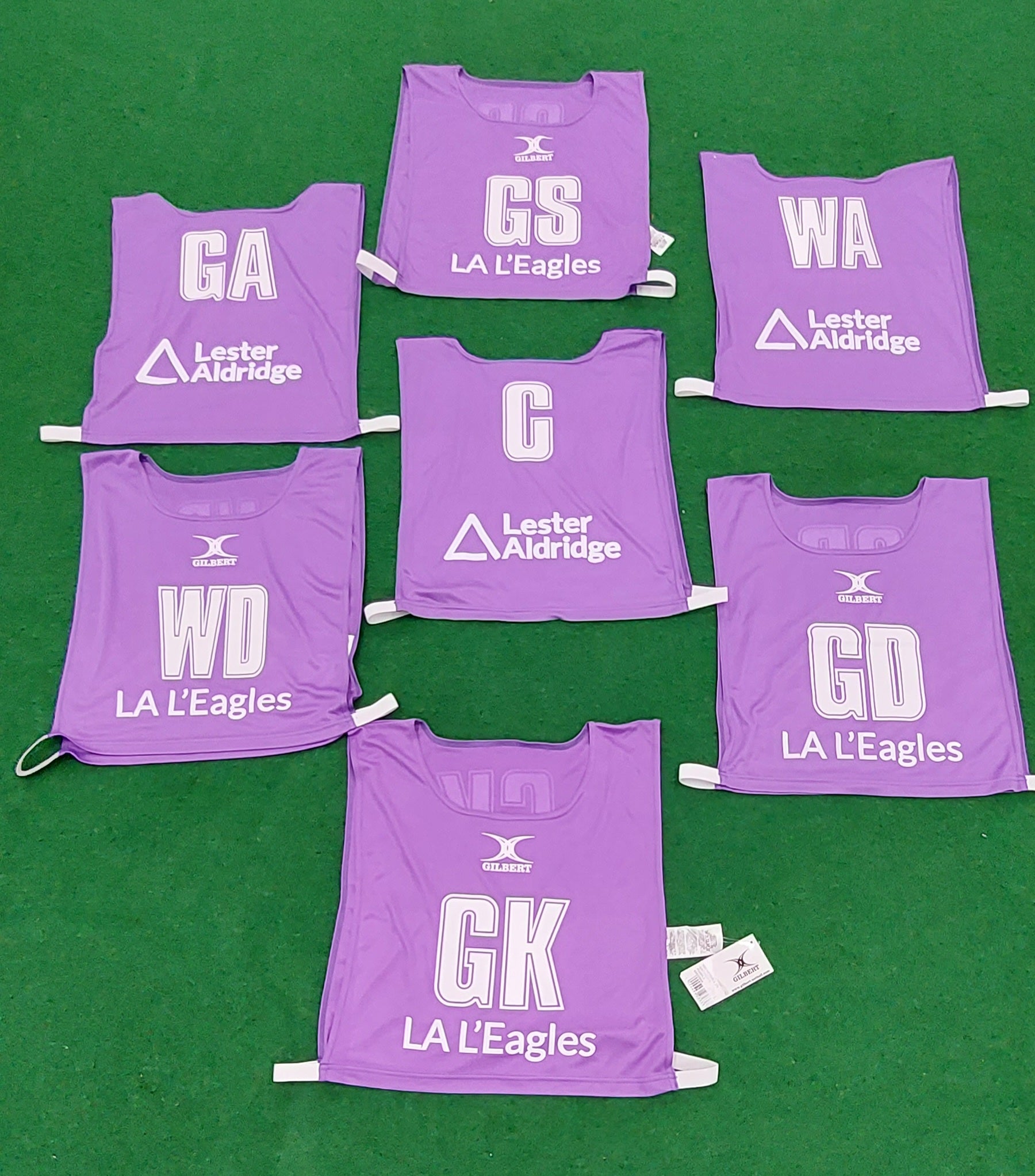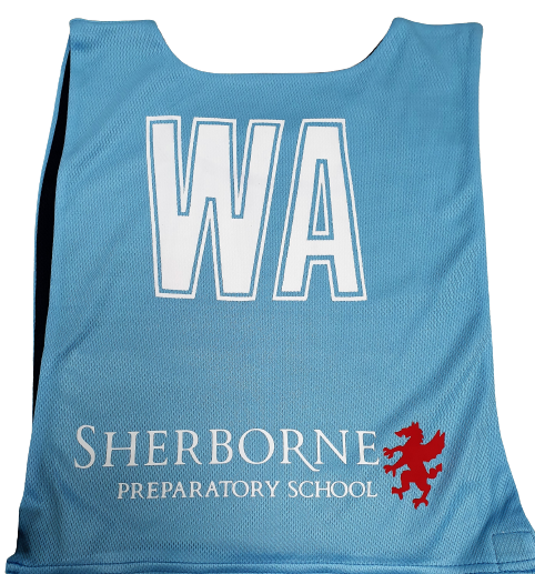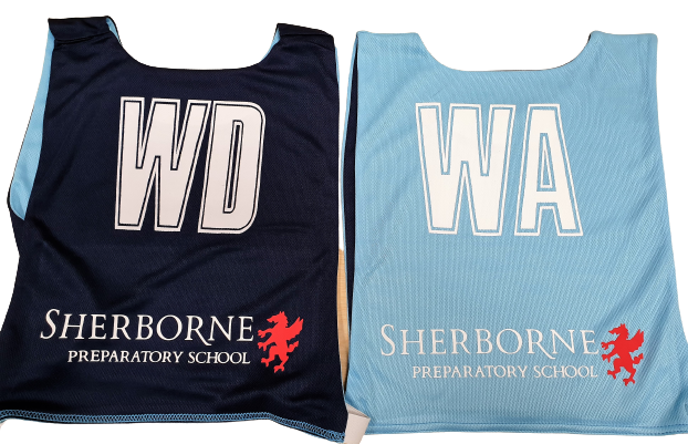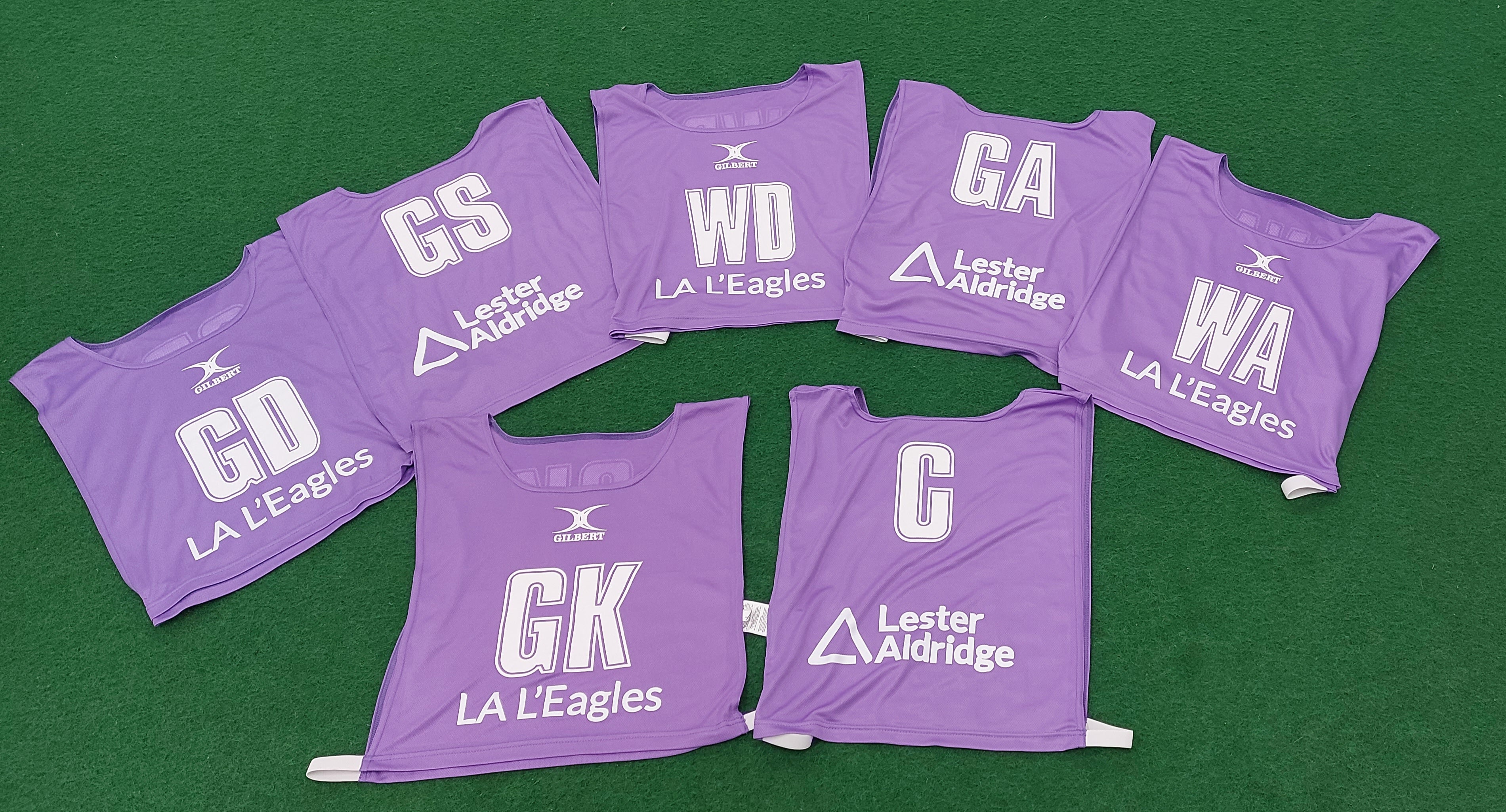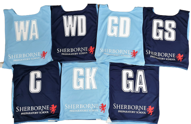 Set of Seven Reversible Gilbert Netball Bibs, personalised with your school, club or sponsor on both rear sides.