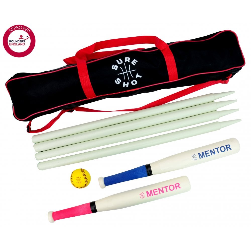 An ideal Rounder set of equipment for use at home. The set consists of 1 x Mentor Blue bat and 1 x Mentor Pink bat for use by all the family. These bats are highly durable wood bats and come with a soft rubber grip. Also included are 1 x Safety ball with soft core centre and 1 x Trainer ball too. To complete the set it also includes wooden posts for marking the pitch. All equipment comes complete in it's own Sure Shot Carry case.